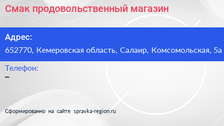 Смак, продовольственный магазин по адресу 652770, Кемеровская область, Салаир, Комсомольская, 5а в дальнейшем Организация, размещена в следующих категориях: