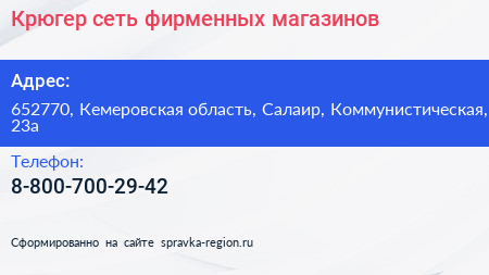 Крюгер, сеть фирменных магазинов по адресу 652770, Кемеровская область, Салаир, Коммунистическая, 23а в дальнейшем Организация, размещена в следующих категориях: