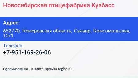 Новосибирская птицефабрика-Кузбасс по адресу 652770, Кемеровская область, Салаир, Комсомольская, 15/1 в дальнейшем Организация, размещена в следующих категориях: