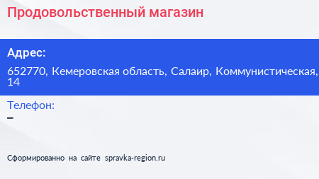 Продовольственный магазин по адресу 652770, Кемеровская область, Салаир, Коммунистическая, 14 в дальнейшем Организация, размещена в следующих категориях: