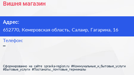 Вишня, магазин по адресу 652770, Кемеровская область, Салаир, Гагарина, 16 в дальнейшем Организация, размещена в следующих категориях: