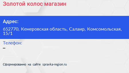 Золотой колос, магазин по адресу 652770, Кемеровская область, Салаир, Комсомольская, 15/1 в дальнейшем Организация, размещена в следующих категориях: