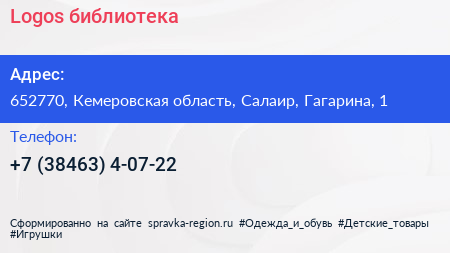 Logos, библиотека по адресу 652770, Кемеровская область, Салаир, Гагарина, 1 в дальнейшем Организация, размещена в следующих категориях: