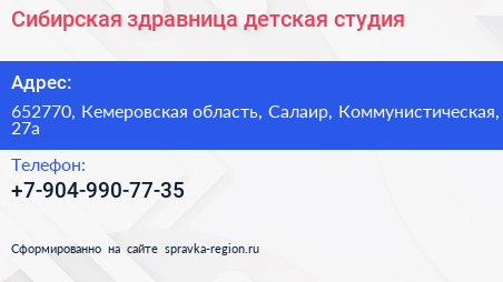Сибирская здравница, детская студия по адресу 652770, Кемеровская область, Салаир, Коммунистическая, 27а в дальнейшем Организация, размещена в следующих категориях: