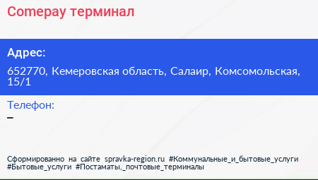 Comepay, терминал по адресу 652770, Кемеровская область, Салаир, Комсомольская, 15/1 в дальнейшем Организация, размещена в следующих категориях: