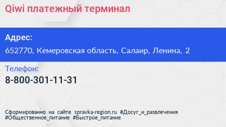 Qiwi, платежный терминал по адресу 652770, Кемеровская область, Салаир, Ленина, 2 в дальнейшем Организация, размещена в следующих категориях: