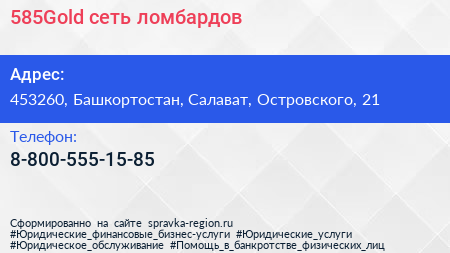 585Gold, сеть ломбардов по адресу 453260, Башкортостан, Салават, Островского, 21 в дальнейшем Организация, размещена в следующих категориях: