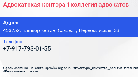 Адвокатская контора №1, коллегия адвокатов по адресу 453252, Башкортостан, Салават, Первомайская, 33 в дальнейшем Организация, размещена в следующих категориях: