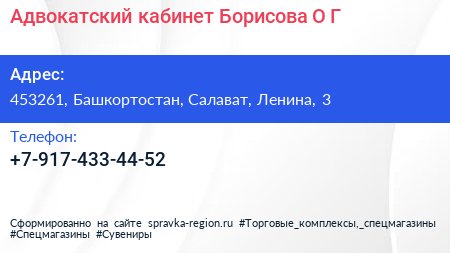Адвокатский кабинет Борисова О.Г. по адресу 453261, Башкортостан, Салават, Ленина, 3 в дальнейшем Организация, размещена в следующих категориях: