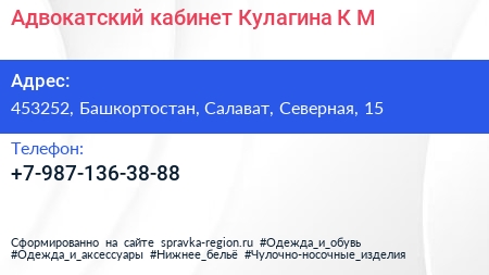 Адвокатский кабинет Кулагина К.М. по адресу 453252, Башкортостан, Салават, Северная, 15 в дальнейшем Организация, размещена в следующих категориях:
