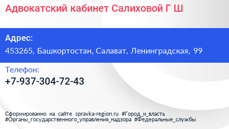 Адвокатский кабинет Салиховой Г.Ш. по адресу 453265, Башкортостан, Салават, Ленинградская, 99 в дальнейшем Организация, размещена в следующих категориях: