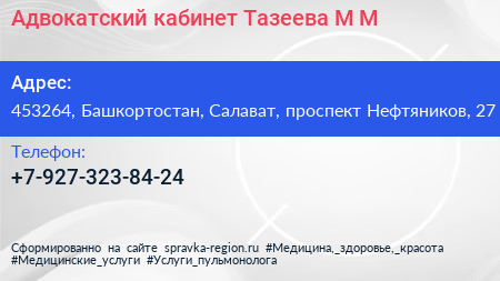 Адвокатский кабинет Тазеева М.М. по адресу 453264, Башкортостан, Салават, проспект Нефтяников, 27 в дальнейшем Организация, размещена в следующих категориях: