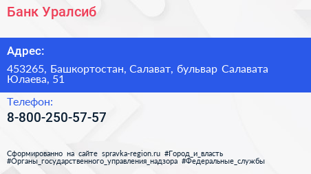 Банк Уралсиб по адресу 453265, Башкортостан, Салават, бульвар Салавата Юлаева, 51 в дальнейшем Организация, размещена в следующих категориях: