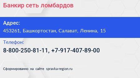 Банкир, сеть ломбардов по адресу 453261, Башкортостан, Салават, Ленина, 15 в дальнейшем Организация, размещена в следующих категориях: