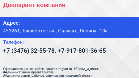 Декларант, компания по адресу 453261, Башкортостан, Салават, Ленина, 13а в дальнейшем Организация, размещена в следующих категориях: