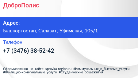 ДоброПолис по адресу Башкортостан, Салават, Уфимская, 105/1 в дальнейшем Организация, размещена в следующих категориях: