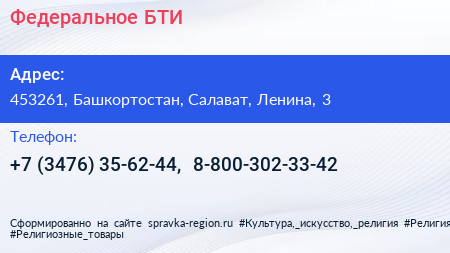 Федеральное БТИ по адресу 453261, Башкортостан, Салават, Ленина, 3 в дальнейшем Организация, размещена в следующих категориях: