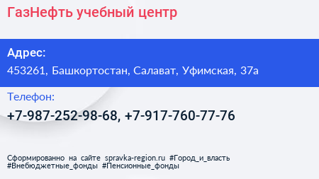 ГазНефть, учебный центр по адресу 453261, Башкортостан, Салават, Уфимская, 37а в дальнейшем Организация, размещена в следующих категориях: