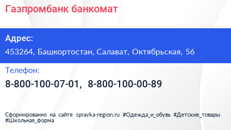 Газпромбанк, банкомат по адресу 453264, Башкортостан, Салават, Октябрьская, 56 в дальнейшем Организация, размещена в следующих категориях: