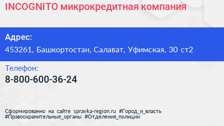 INCOGNITO, микрокредитная компания по адресу 453261, Башкортостан, Салават, Уфимская, 30 ст2 в дальнейшем Организация, размещена в следующих категориях: