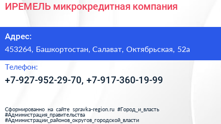 ИРЕМЕЛЬ, микрокредитная компания по адресу 453264, Башкортостан, Салават, Октябрьская, 52а в дальнейшем Организация, размещена в следующих категориях: