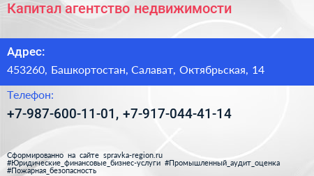 Капитал, агентство недвижимости по адресу 453260, Башкортостан, Салават, Октябрьская, 14 в дальнейшем Организация, размещена в следующих категориях: