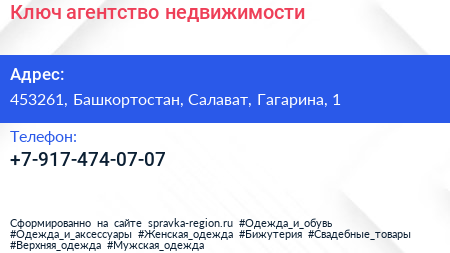 Ключ, агентство недвижимости по адресу 453261, Башкортостан, Салават, Гагарина, 1 в дальнейшем Организация, размещена в следующих категориях:
