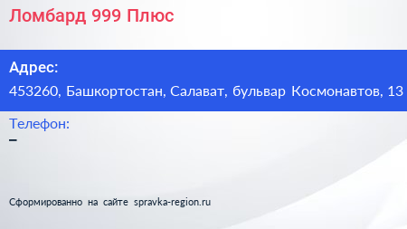Ломбард 999 Плюс по адресу 453260, Башкортостан, Салават, бульвар Космонавтов, 13 в дальнейшем Организация, размещена в следующих категориях: