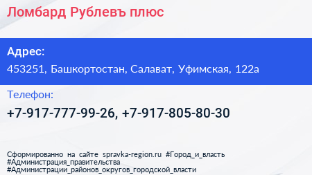Ломбард Рублевъ плюс по адресу 453251, Башкортостан, Салават, Уфимская, 122а в дальнейшем Организация, размещена в следующих категориях: