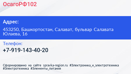 ОсагоРФ102 по адресу 453250, Башкортостан, Салават, бульвар Салавата Юлаева, 16 в дальнейшем Организация, размещена в следующих категориях: