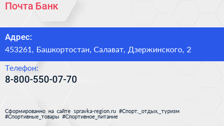 Почта Банк по адресу 453261, Башкортостан, Салават, Дзержинского, 2 в дальнейшем Организация, размещена в следующих категориях: