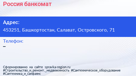 Россия, банкомат по адресу 453251, Башкортостан, Салават, Островского, 71 в дальнейшем Организация, размещена в следующих категориях: