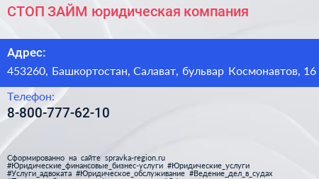 СТОП ЗАЙМ, юридическая компания по адресу 453260, Башкортостан, Салават, бульвар Космонавтов, 16 в дальнейшем Организация, размещена в следующих категориях: