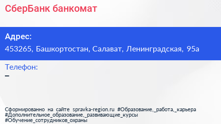 СберБанк, банкомат по адресу 453265, Башкортостан, Салават, Ленинградская, 95а в дальнейшем Организация, размещена в следующих категориях: