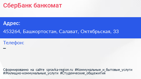 СберБанк, банкомат по адресу 453264, Башкортостан, Салават, Октябрьская, 33 в дальнейшем Организация, размещена в следующих категориях: