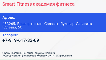 Smart Fitness, академия фитнеса по адресу 453265, Башкортостан, Салават, бульвар Салавата Юлаева, 50 в дальнейшем Организация, размещена в следующих категориях: