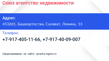 Союз, агентство недвижимости по адресу 453261, Башкортостан, Салават, Ленина, 13 в дальнейшем Организация, размещена в следующих категориях: