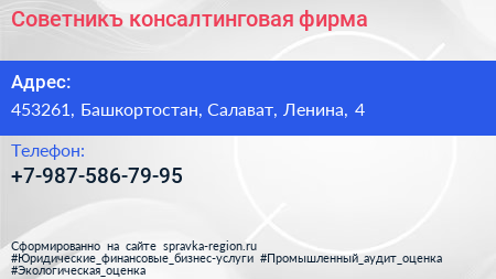 Советникъ, консалтинговая фирма по адресу 453261, Башкортостан, Салават, Ленина, 4 в дальнейшем Организация, размещена в следующих категориях: