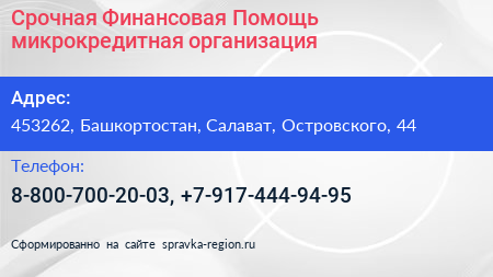 Срочная Финансовая Помощь, микрокредитная организация по адресу 453262, Башкортостан, Салават, Островского, 44 в дальнейшем Организация, размещена в следующих категориях: