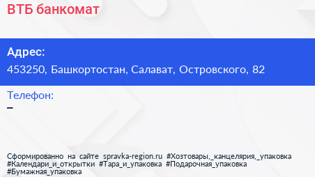 ВТБ, банкомат по адресу 453250, Башкортостан, Салават, Островского, 82 в дальнейшем Организация, размещена в следующих категориях: