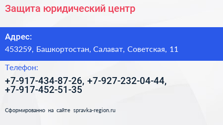 Защита, юридический центр по адресу 453259, Башкортостан, Салават, Советская, 11 в дальнейшем Организация, размещена в следующих категориях: