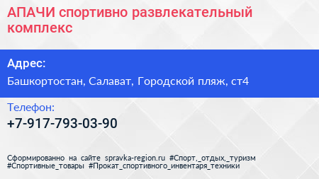 АПАЧИ, спортивно-развлекательный комплекс по адресу Башкортостан, Салават, Городской пляж, ст4 в дальнейшем Организация, размещена в следующих категориях: