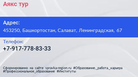 Аякс тур по адресу 453250, Башкортостан, Салават, Ленинградская, 67 в дальнейшем Организация, размещена в следующих категориях: