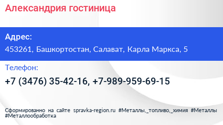 Александрия, гостиница по адресу 453261, Башкортостан, Салават, Карла Маркса, 5 в дальнейшем Организация, размещена в следующих категориях: