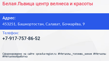 Белая Львица, центр велнеса и красоты по адресу 453251, Башкортостан, Салават, Бочкарёва, 9 в дальнейшем Организация, размещена в следующих категориях: