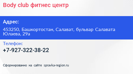 Body club, фитнес центр по адресу 453250, Башкортостан, Салават, бульвар Салавата Юлаева, 29а в дальнейшем Организация, размещена в следующих категориях:
