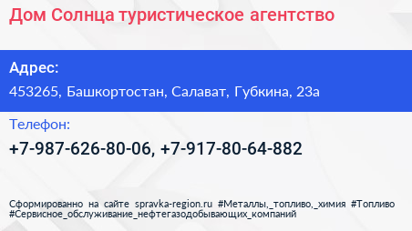 Дом Солнца, туристическое агентство по адресу 453265, Башкортостан, Салават, Губкина, 23а в дальнейшем Организация, размещена в следующих категориях: