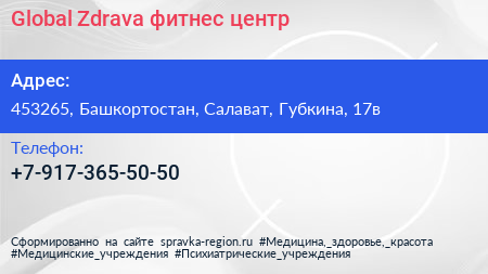 Global Zdrava, фитнес-центр по адресу 453265, Башкортостан, Салават, Губкина, 17в в дальнейшем Организация, размещена в следующих категориях: