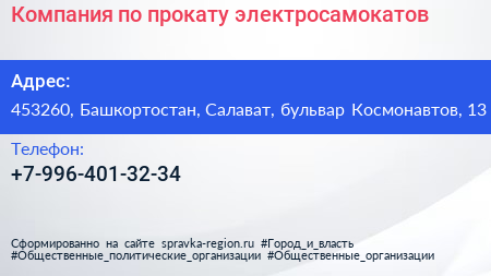 Компания по прокату электросамокатов по адресу 453260, Башкортостан, Салават, бульвар Космонавтов, 13 в дальнейшем Организация, размещена в следующих категориях: