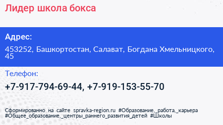 Лидер, школа бокса по адресу 453252, Башкортостан, Салават, Богдана Хмельницкого, 45 в дальнейшем Организация, размещена в следующих категориях: